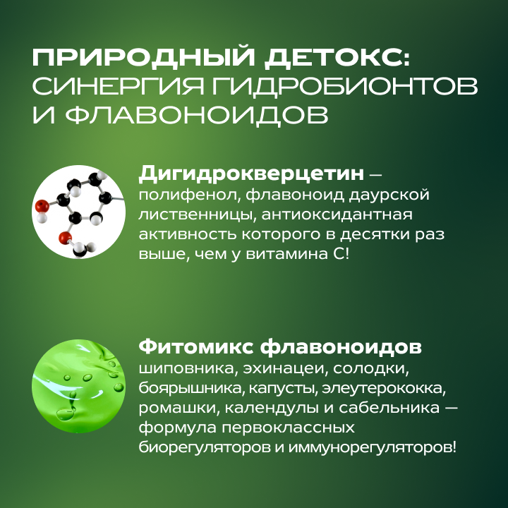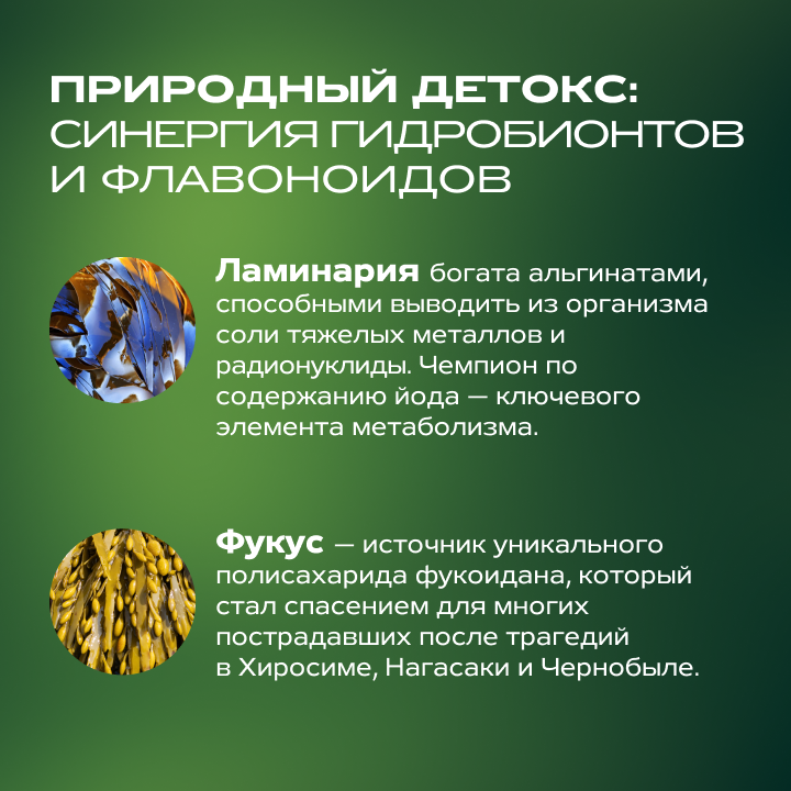 Дигидрокверцетин. Природный антиоксидант с активностью, превосходящей витамины В, С, бета-каротин и токоферол в десятки раз. Замедляет процессы старения. В сочетании с ламинарией и фукусом дает мощный синергетический эффект.
