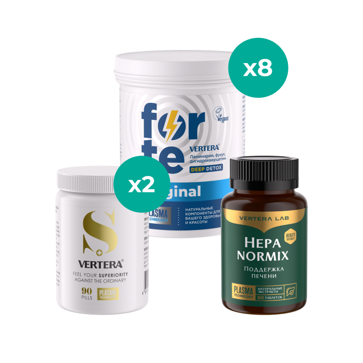 Продукты VERTERA в наборе №2 комплексно обеспечат ваш организм витаминами и минералами, полезными полисахаридами и альгинатами для деликатного и эффективного детокса на курсе VODOROSLIM!